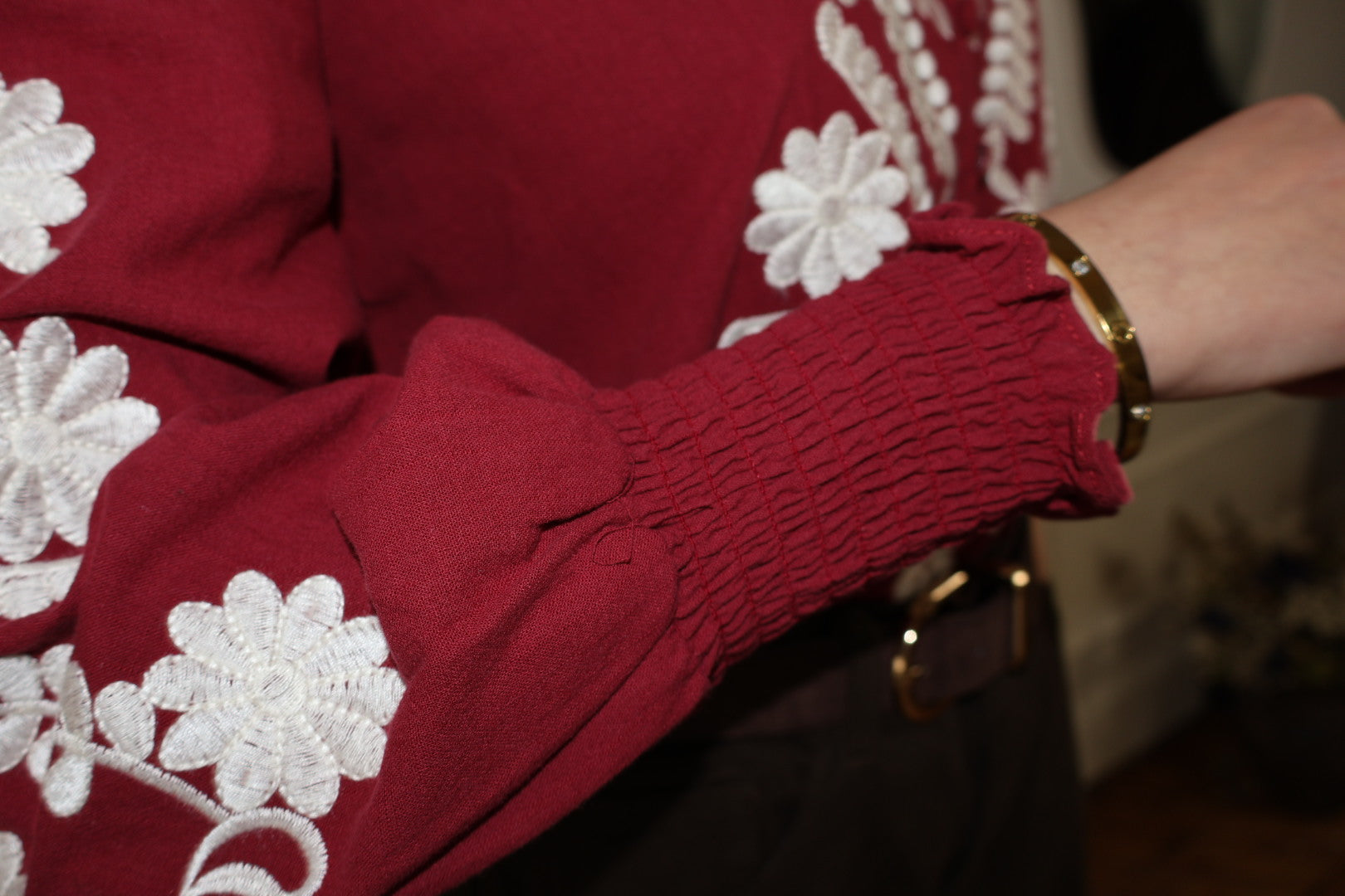 • Farbe: Stickerei in Bordeaux und Ecru